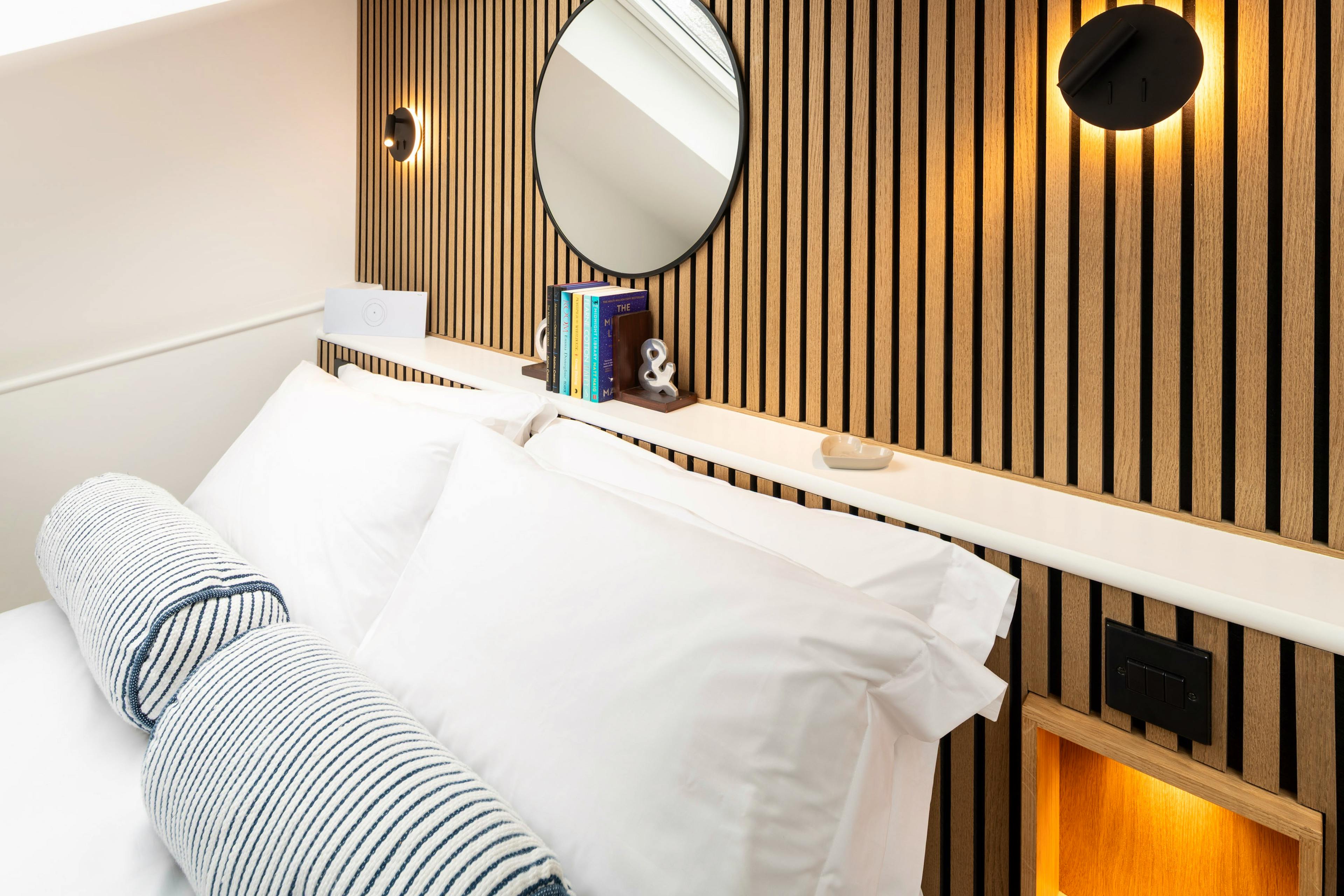 Relax in a compact lounge with a comfy sofa bed, warm textures and thoughtful lighting that invite you to unwind.