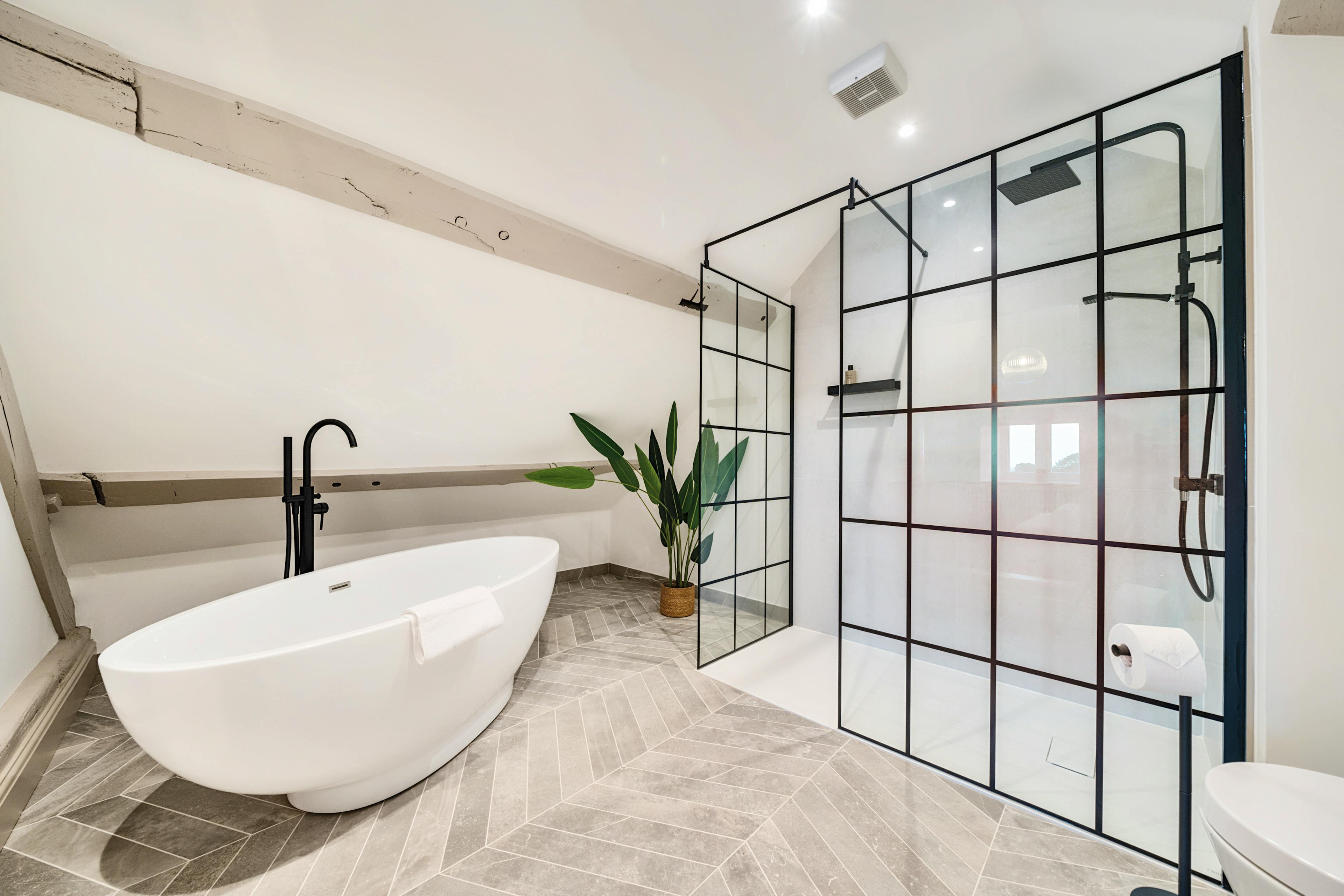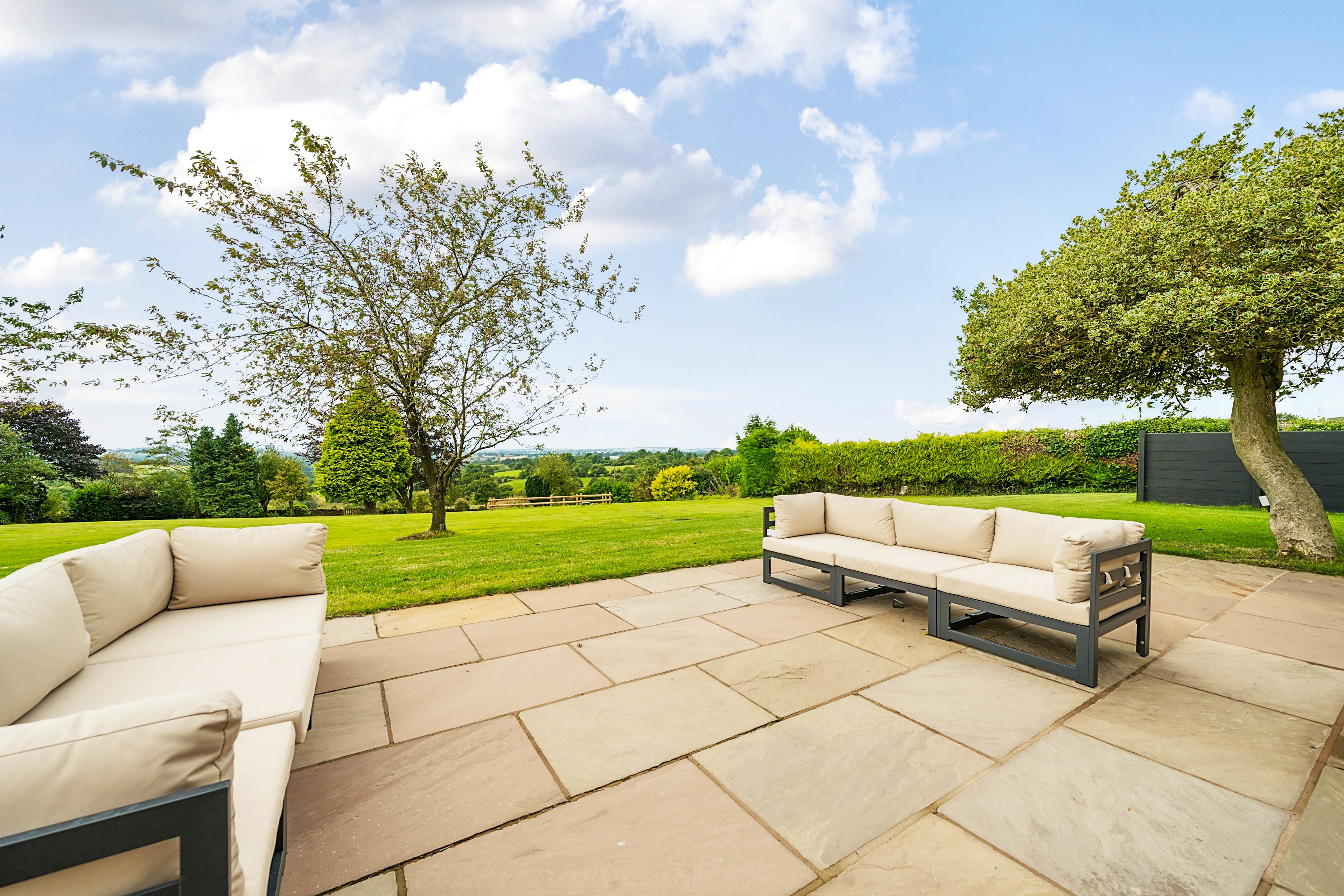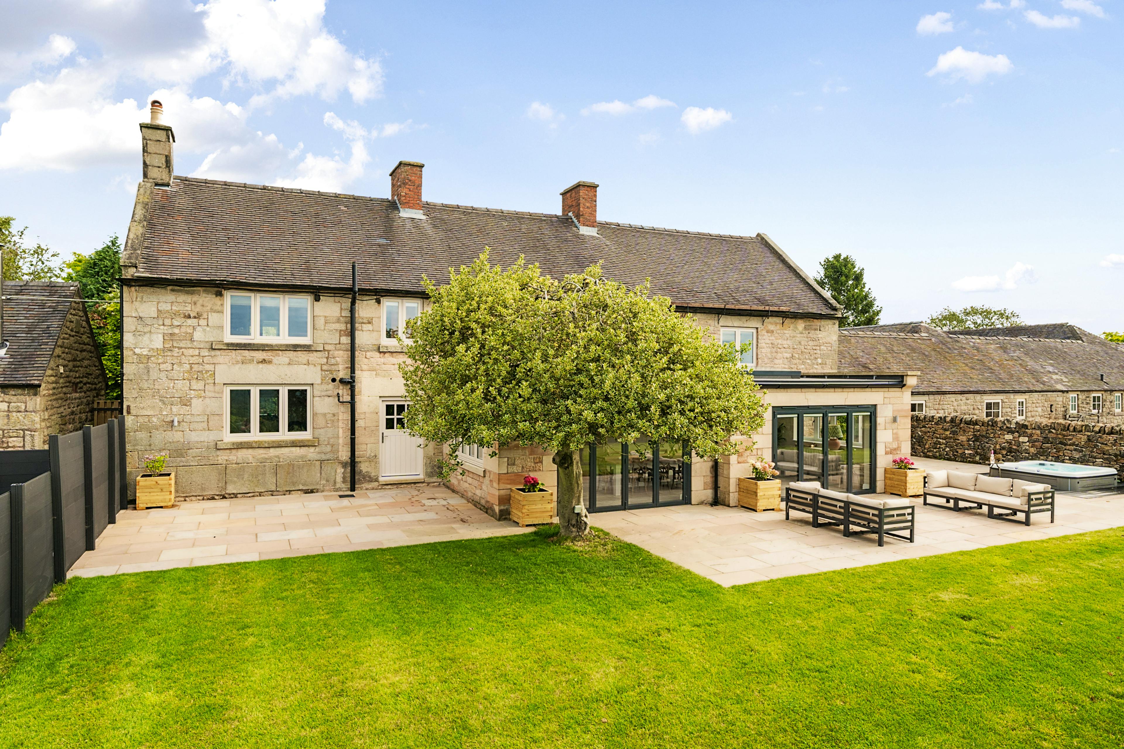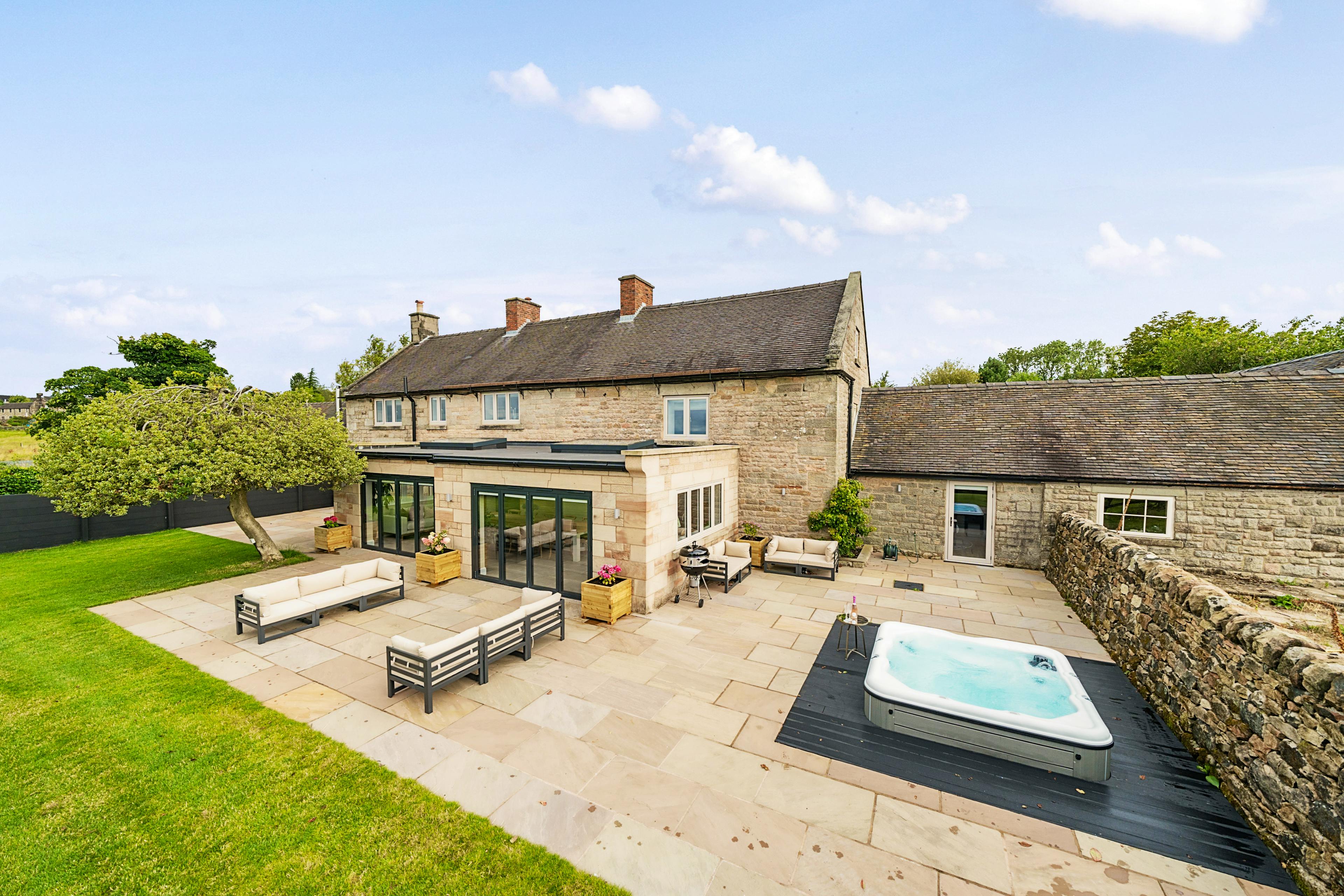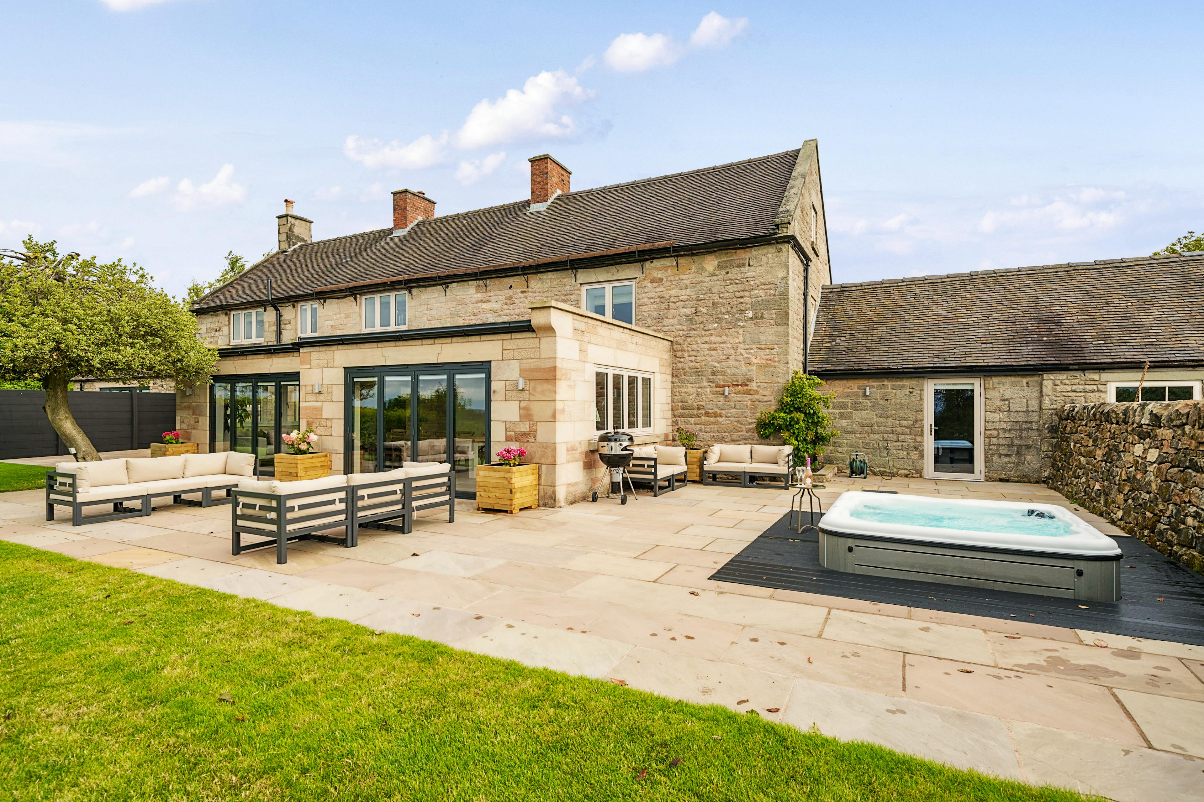 Wellcroft Farmhouse is your luxury escape in the beautiful Staffordshire countryside. With space for 10 guests in five bedrooms and located just 10 minutes from Alton Towers, it’s the perfect base for families visiting the park. Those who prefer a slower pace of life are treated to an outdoor private hot tub, a huge garden and miles of hiking trails directly from the front door. Easily accessible from Manchester, Birmingham, Sheffield and the East Midlands it’s the ideal family home from home. As you pull up to Wellcroft Farmhouse, the imposing stone building stands out against the green landscapes beyond. Walk through the front door and the stylish, contemporary interiors welcome you in. The kitchen is the heart of the home and Wellcroft Farmhouse is no exception. With artisan cabinetry and quartz counters, it’s your space to wine, dine and spend time with loved ones. Two ovens and two fridges ensure that cooking is a breeze, while the open-plan dining room has space for everyone around the table. In the summer, the large patio with outdoor furniture is the perfect spot to dine alfresco before pouring a glass of something cold and sinking into your private hot tub. The vast garden is truly the cherry on the cake, with plenty of space for the kids to run around and the adults to catch some sun. During the colder months, the traditional living room is a comforting escape from the outside. Thick sofas surround a modern woodburner which creates a warming, cosy glow. In the evenings, why not curl up under a blanket and watch a movie on the Smart TV? As the night draws in and it’s time to head to bed, five ensuite bedrooms provide a space to rest weary heads. Three king size bedrooms, a double and a twin are all adorned with luxury bedding to drift off under. For a real treat, sink into the freestanding bath in the master bedroom after a long day. Nestled in the picturesque village of Stanton on the edge of the Peak District National Park, the thrilling rollercoasters and enchanting kingdoms of Alton Towers are just 10 minutes away. Offering the perfect base to explore the park, Wellcroft Farmhouse is easy to reach from Birmingham, Manchester and London. For something more peaceful, lace up your hiking boots and explore the beautiful peaks before stopping for something to eat in Buxton, Matlock or Ashbourne.