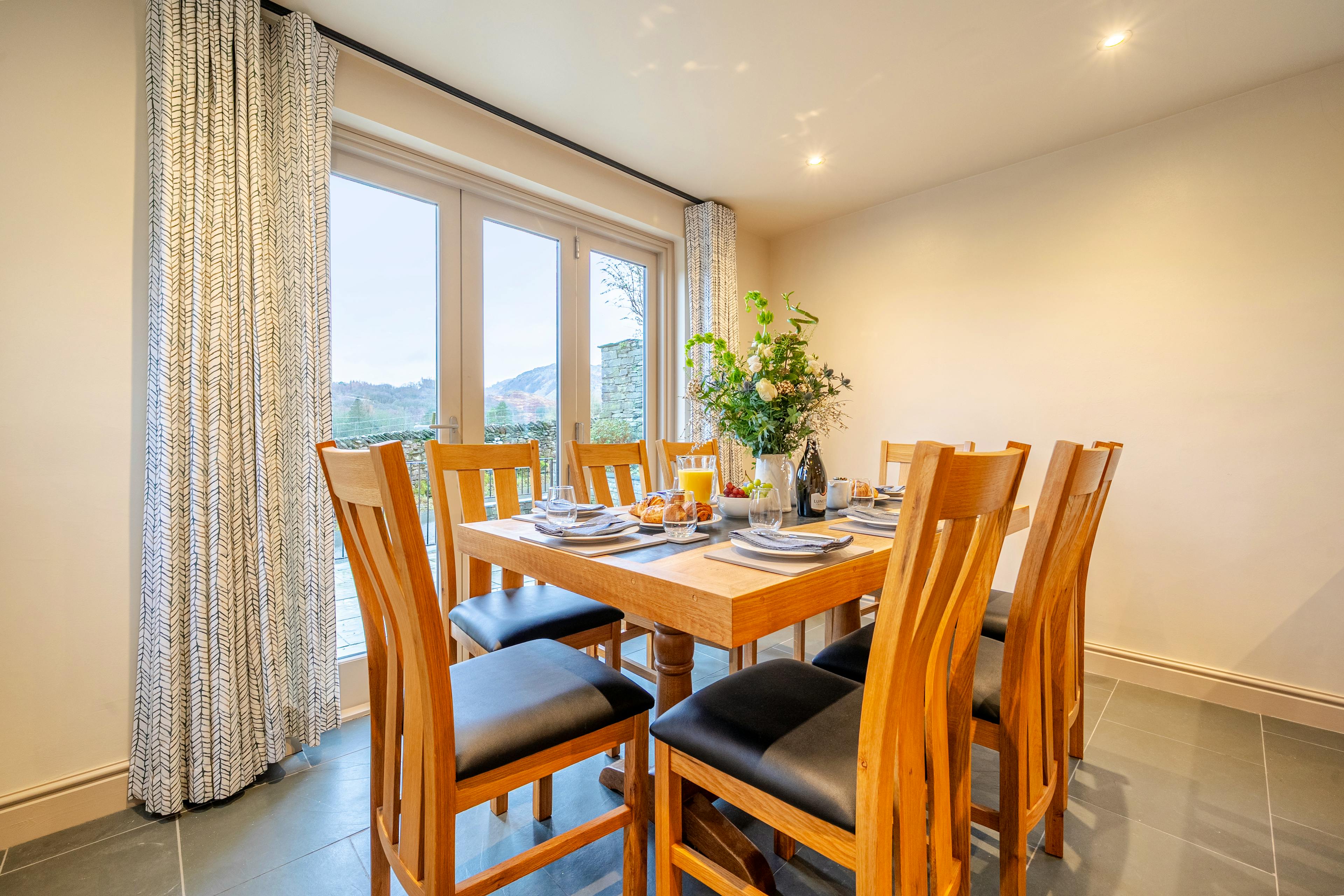 Tucked into the heart of Little Langdale, Wetherlam View is a beautifully renovated chalet-style retreat with some of the most impressive south-facing views in the valley. Floor-to-ceiling bifold doors and a wide balcony frame Wetherlam Fell, Swirl How and the Tilberthwaite Valley, creating a constant connection to the landscape. Whether you’re gathered around the table after a long walk or watching the light shift across the fells from the sofa, this is a place designed to make the most of its setting. Inside, the house has been thoughtfully modernised to balance style, comfort and practicality. The open-plan living space is generous and light-filled, with a large Smart TV, a sleek bio-ethanol fireplace and bifold doors opening onto the balcony. The kitchen-dining area is equally social, well equipped for relaxed group meals and long breakfasts, with doors that spill straight out onto the terrace for alfresco dining on warmer days. Sleeping arrangements are flexible and well suited to groups or extended families. The main house has three beautifully finished bedrooms, including a spacious master bedroom with ensuite and underfloor heating, a twin room with ensuite and a further double bedroom with its own dedicated bathroom. A separate annex provides additional space for extra guests, offering privacy without losing the feeling of being together. For downtime, Wetherlam View really comes into its own. There’s a dedicated cinema and games room with an 85-inch Smart TV and arcade games, alongside a sauna for post-walk relaxation. Dog owners are especially well catered for, with a professional dog wash and grooming area, a clever underfloor dog hotel and plenty of space for muddy paws to dry off. Outdoor patio and balcony furniture is provided between easter and October along with a gas BBQ, which makes unwinding in the summer sunshine a delight. Grill up some delicious local produce and take in your surroundings in style. Step outside and you’re perfectly placed for exploring Little Langdale on foot. Slater’s Bridge is just moments away, Blea Tarn is a scenic stroll and some of the Lake District’s most rewarding walks begin right from the door. With the Three Shires Inn next door and countless food spots across the National Park within easy reach, Wetherlam View offers a rare blend of seclusion, scenery and sociable village life.