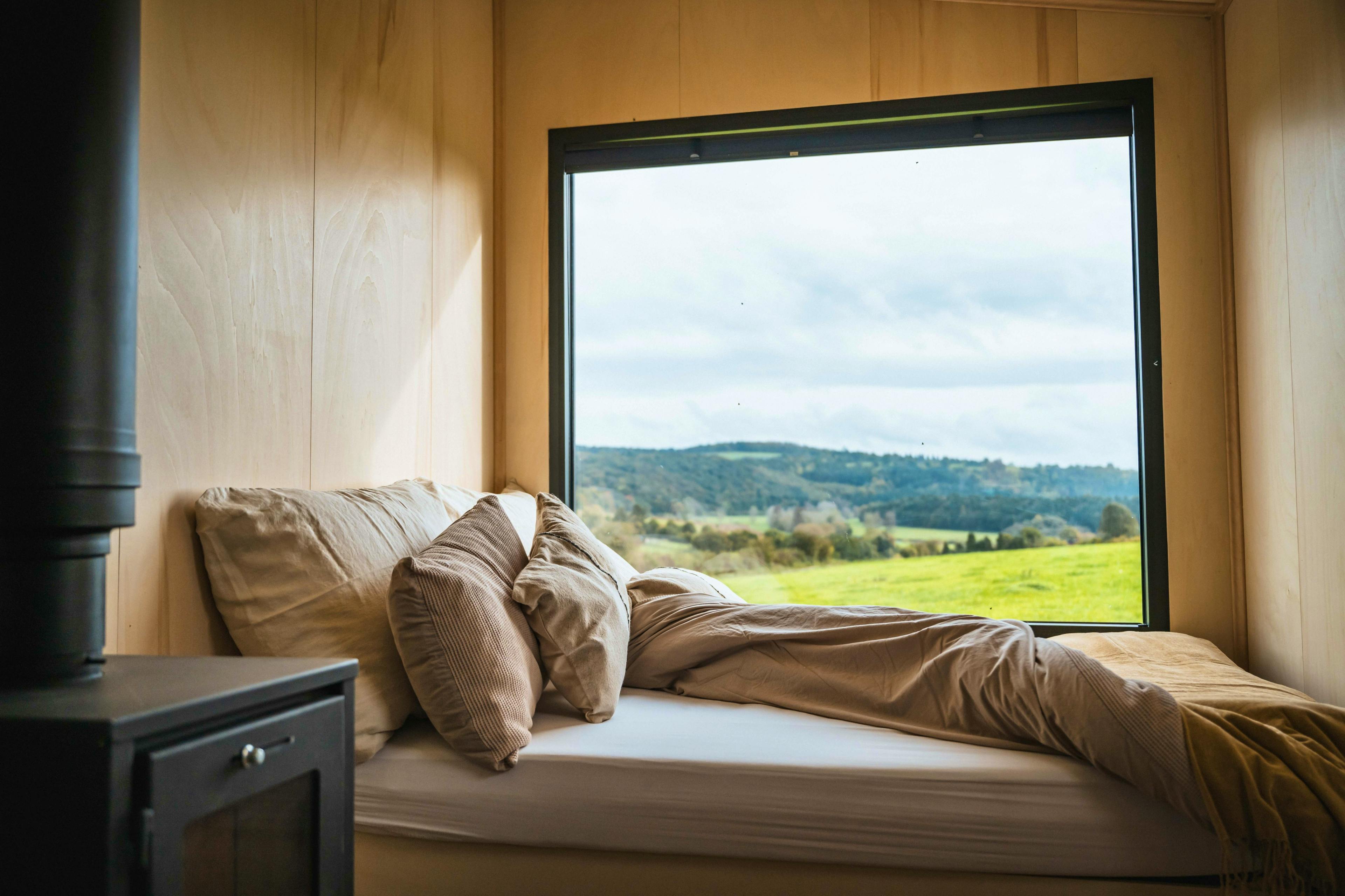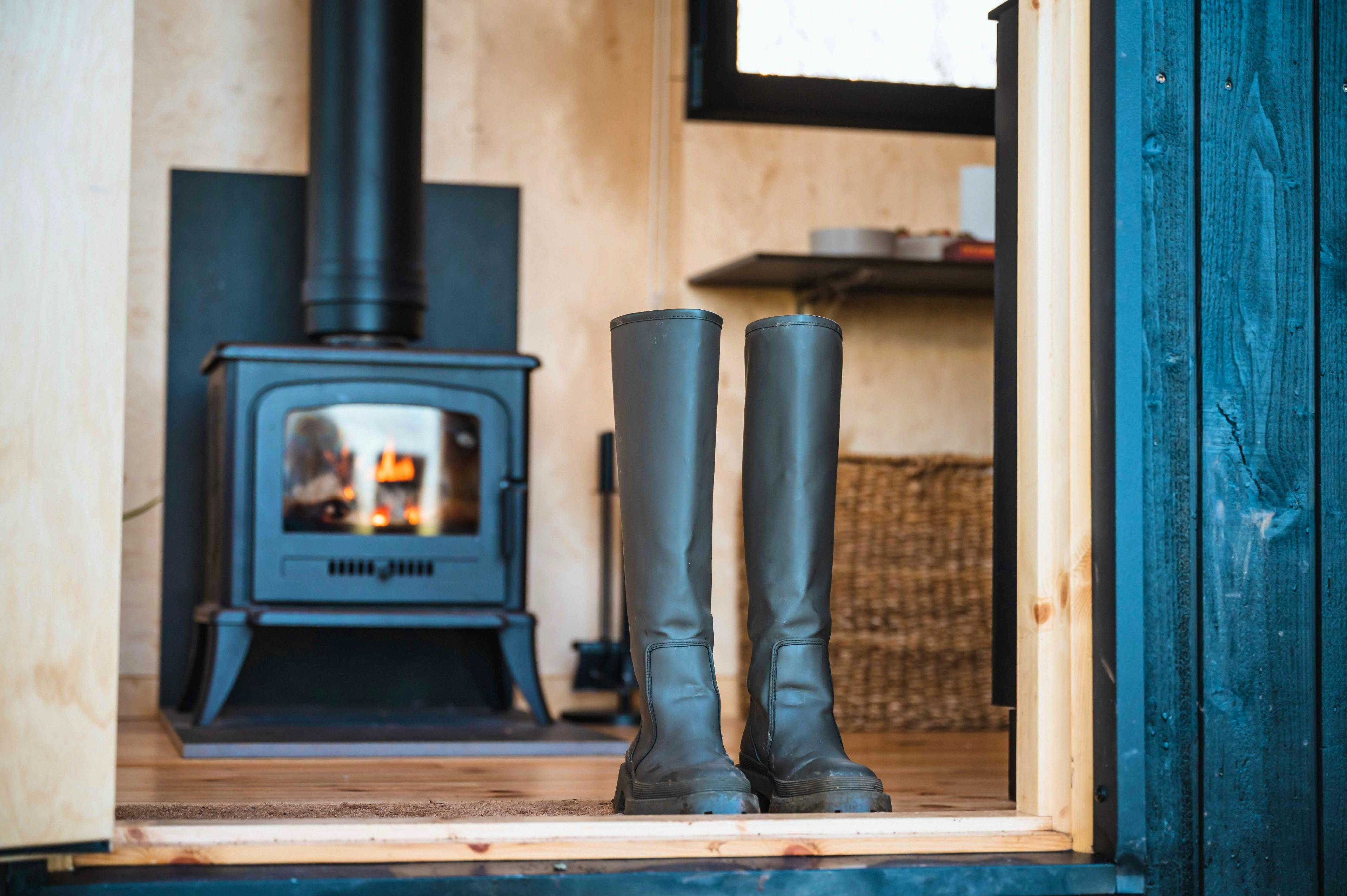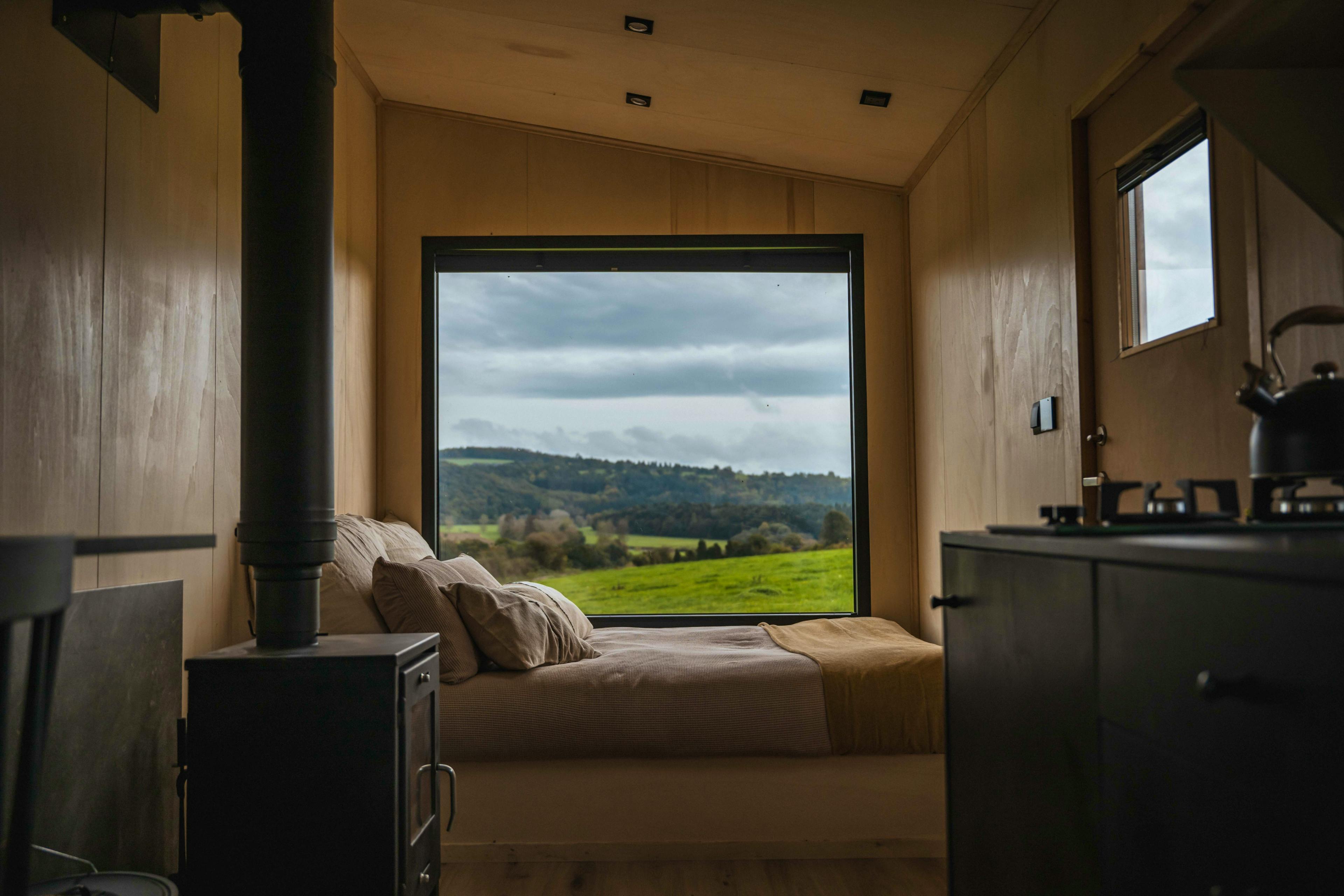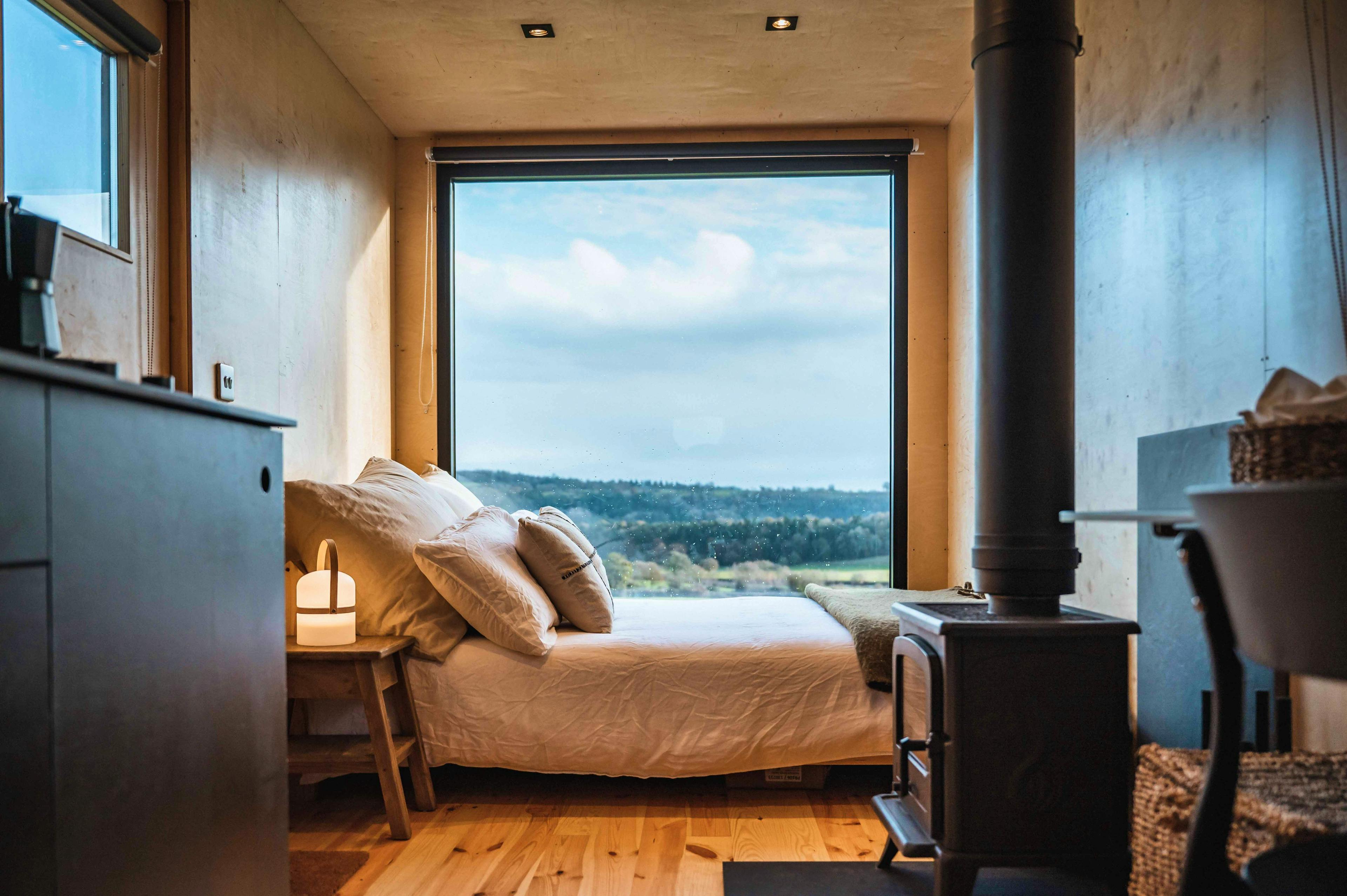 Cosy interiors with wood-burning stove, double bed and large picture window framing countryside views.