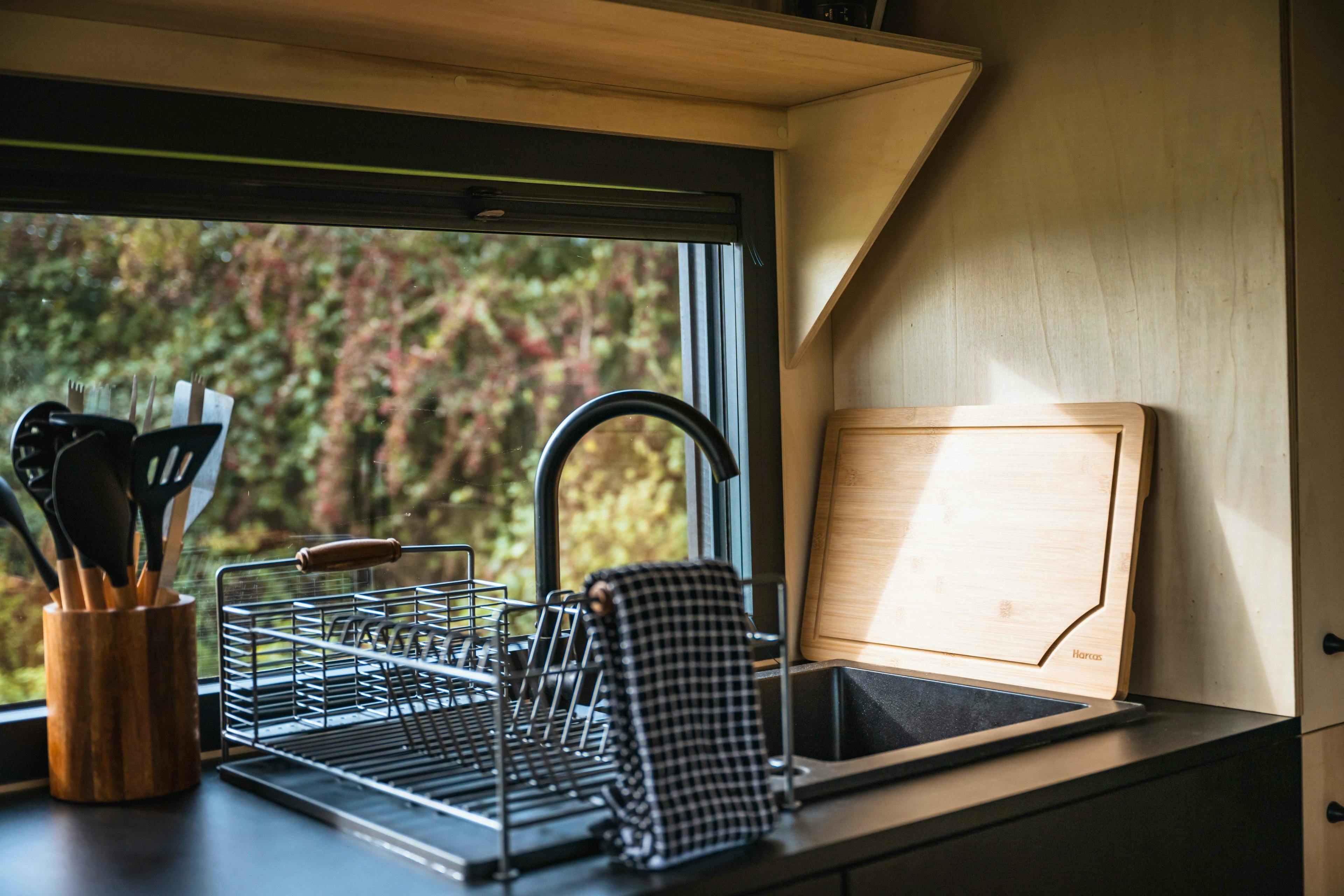 Well-equipped kitchenette with gas hob, fridge and cafetiere for easy self-catering stays.