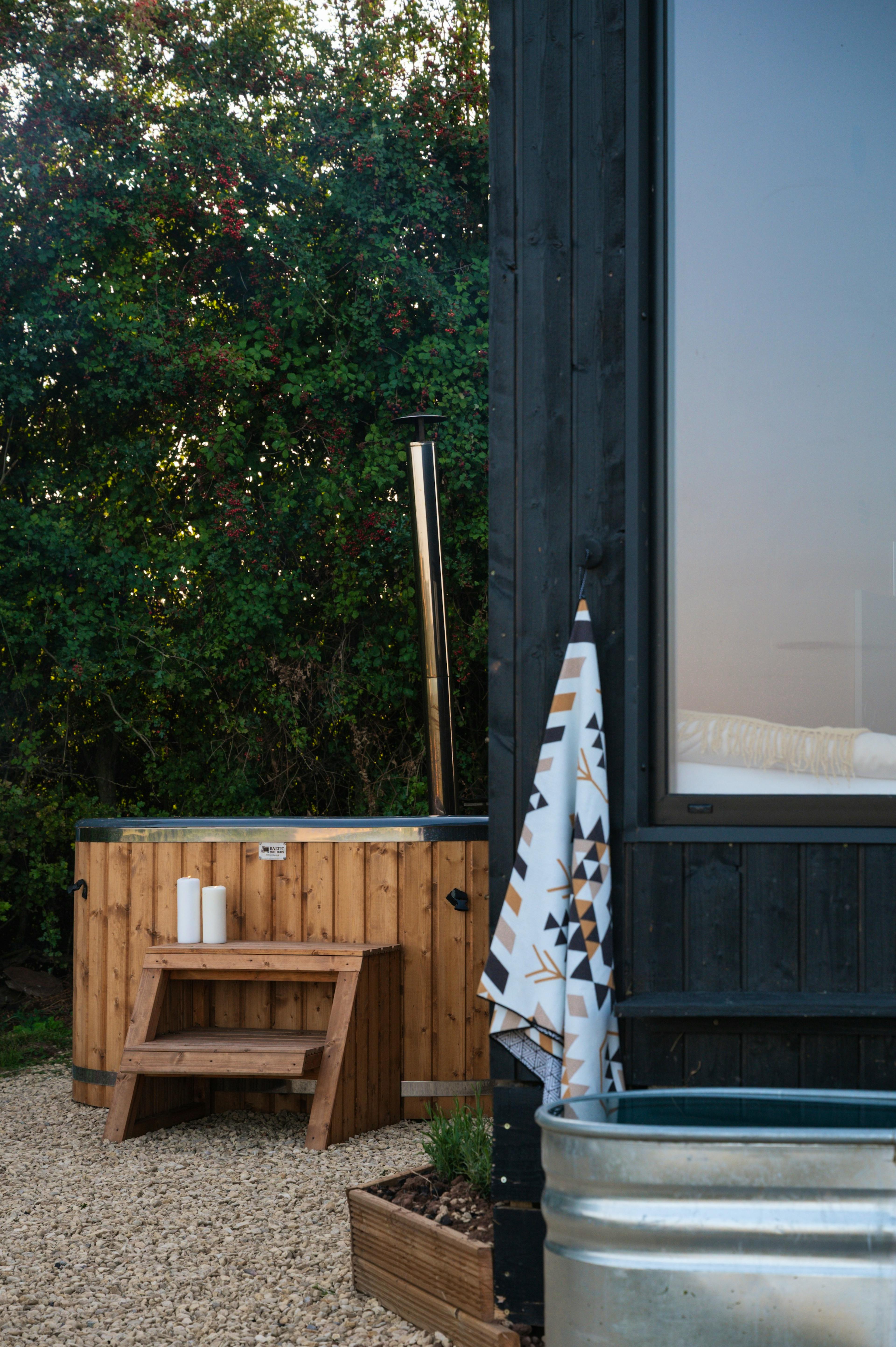 Private wood-fired hot tub at each cabin for dreamy evening soaks beneath starry skies.