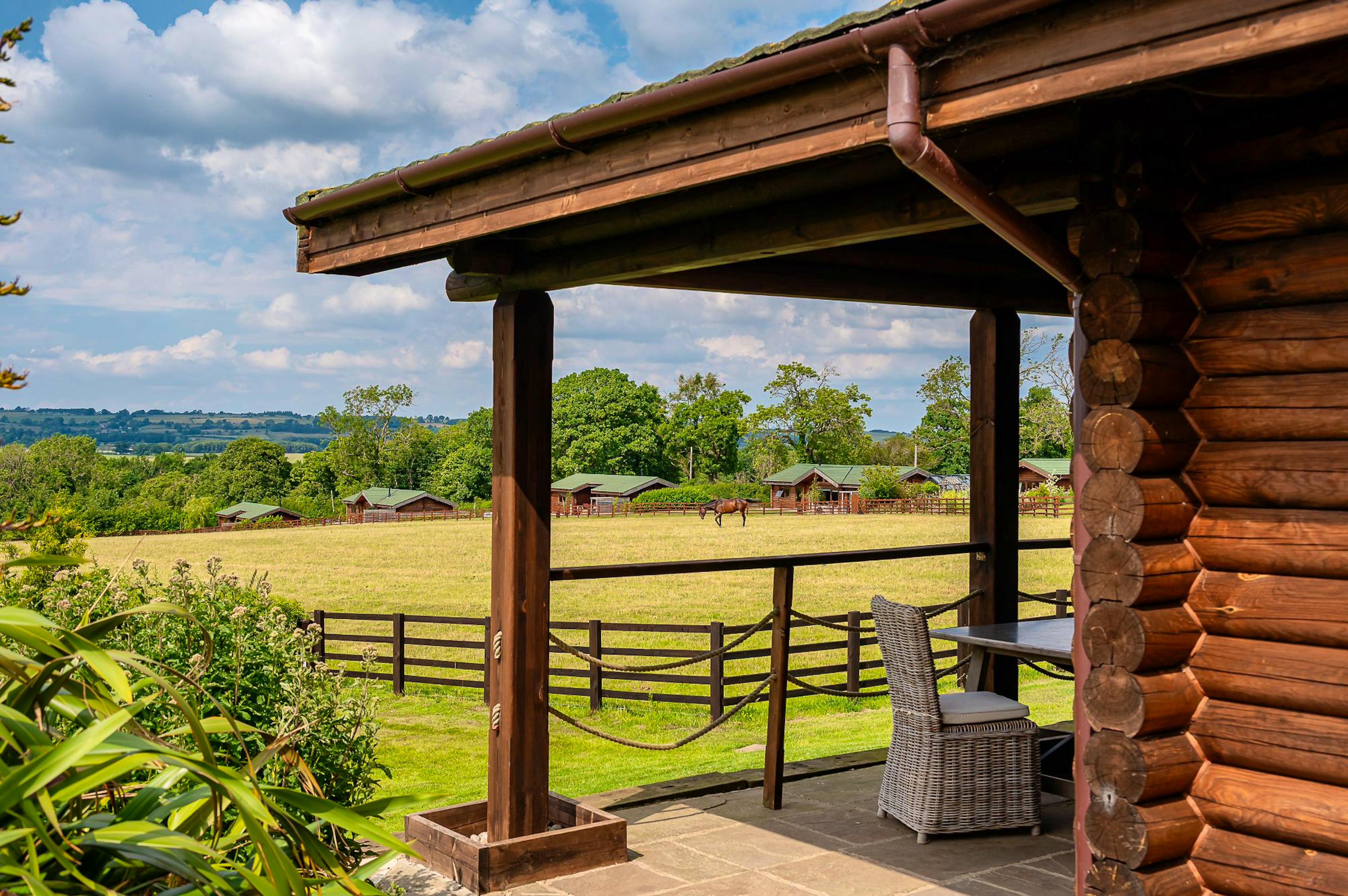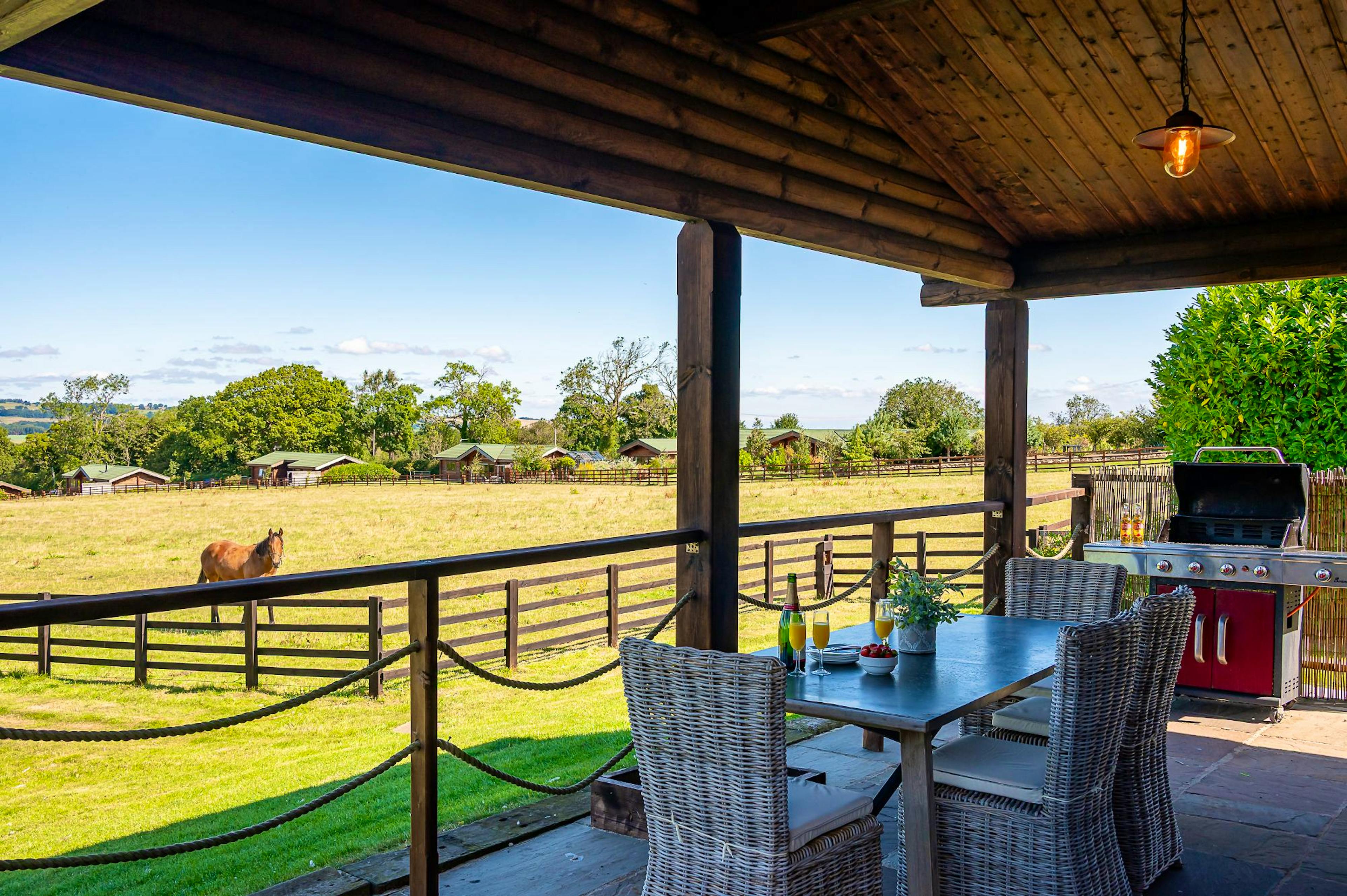 Elevated private patio and fully enclosed garden with breathtaking views of grazing racehorses and surrounding hills, ideal for relaxation or dog-friendly breaks.