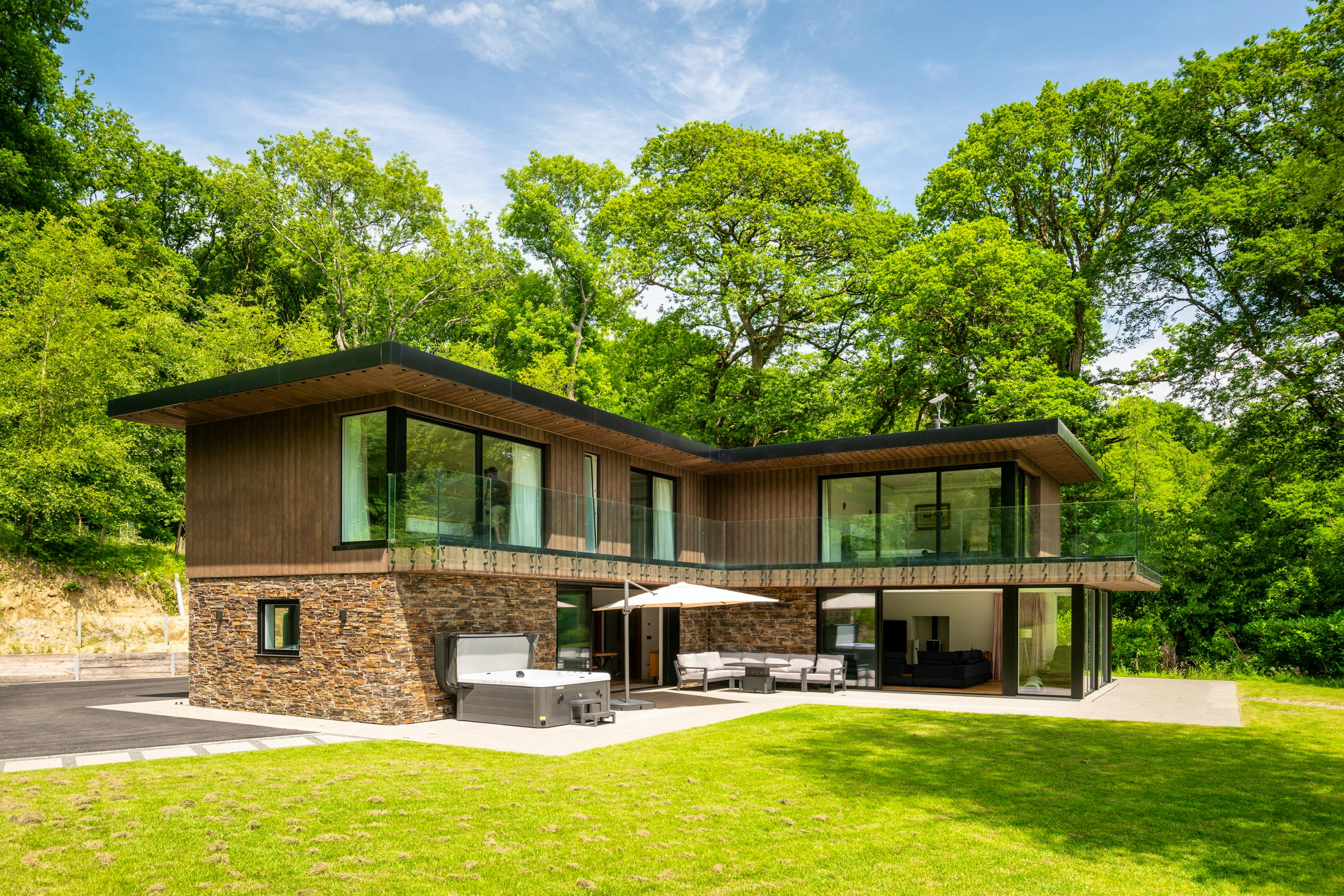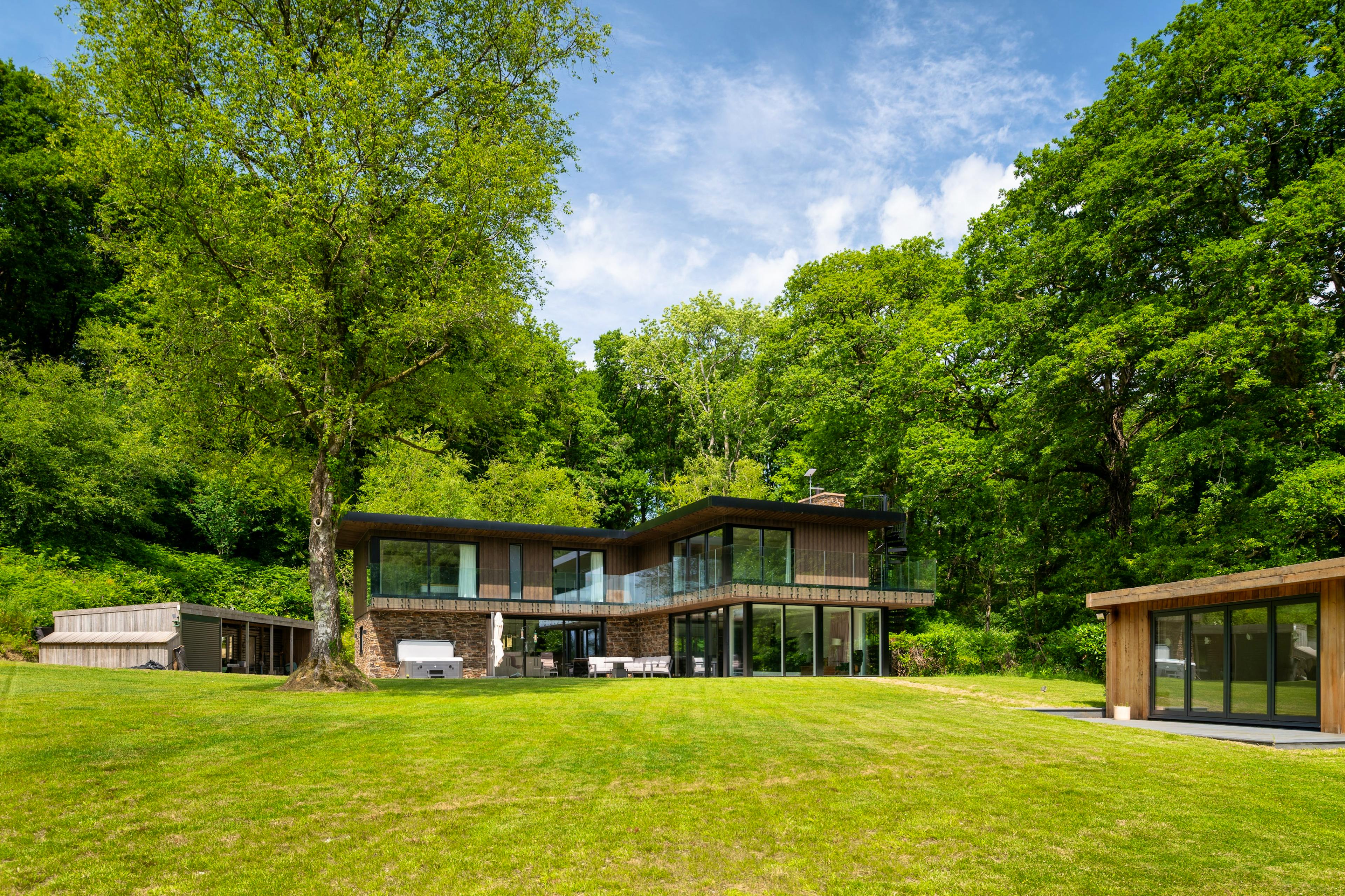 Stunning contemporary lodge in a private East Devon woodland with hot tub and dreamy views.